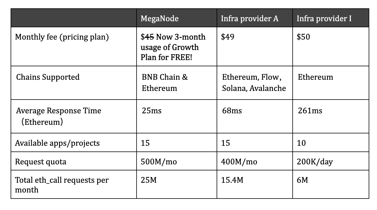 Compared with existing infrastructure providers, MegaNode outperformed them in the below-highlighted categories.